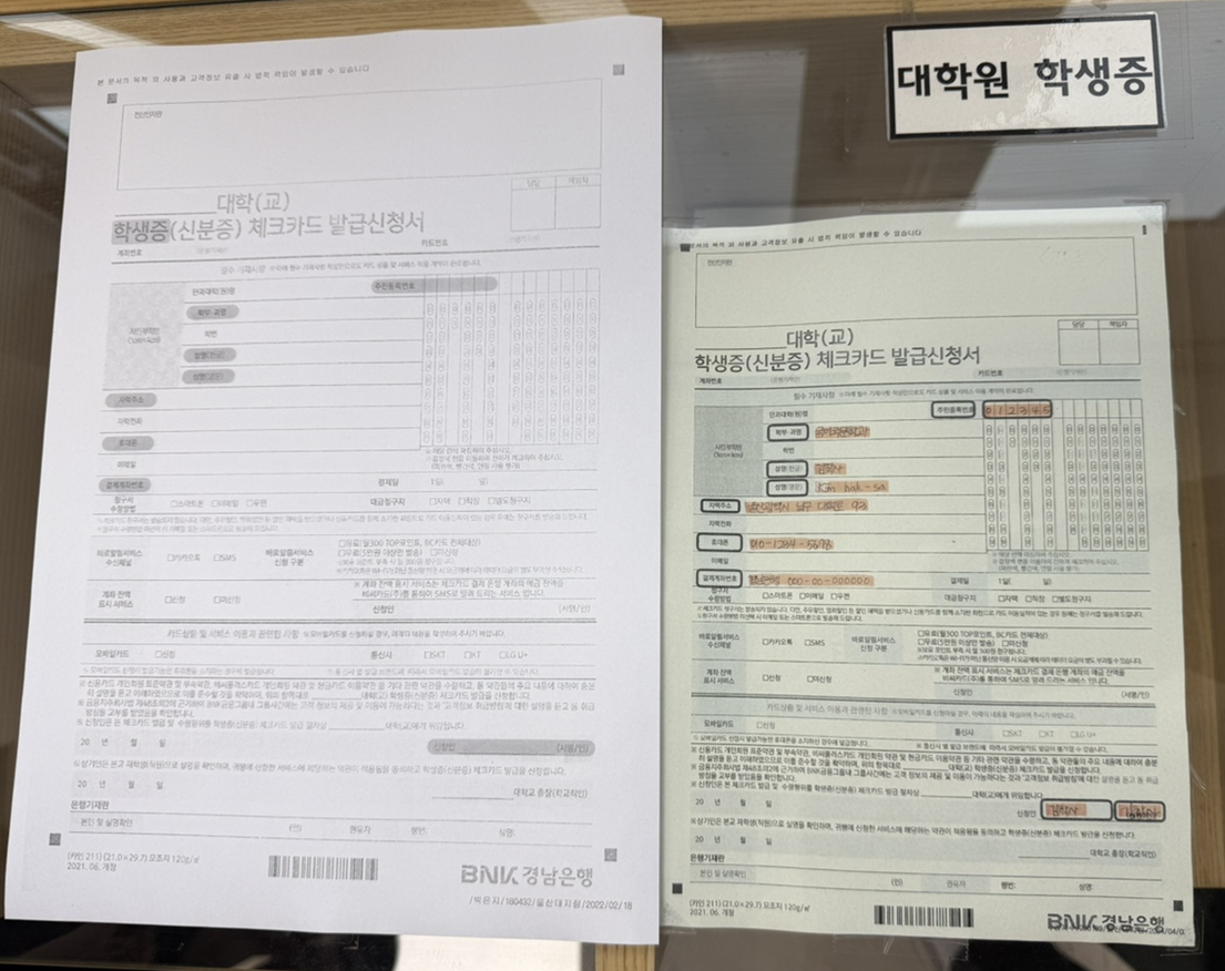 2) 작성한 서류 및 신분증 지참 후 경남은행 울산대학교 지점 직접 방문 <은행업무시간(09:00~15:30) 내 방문>